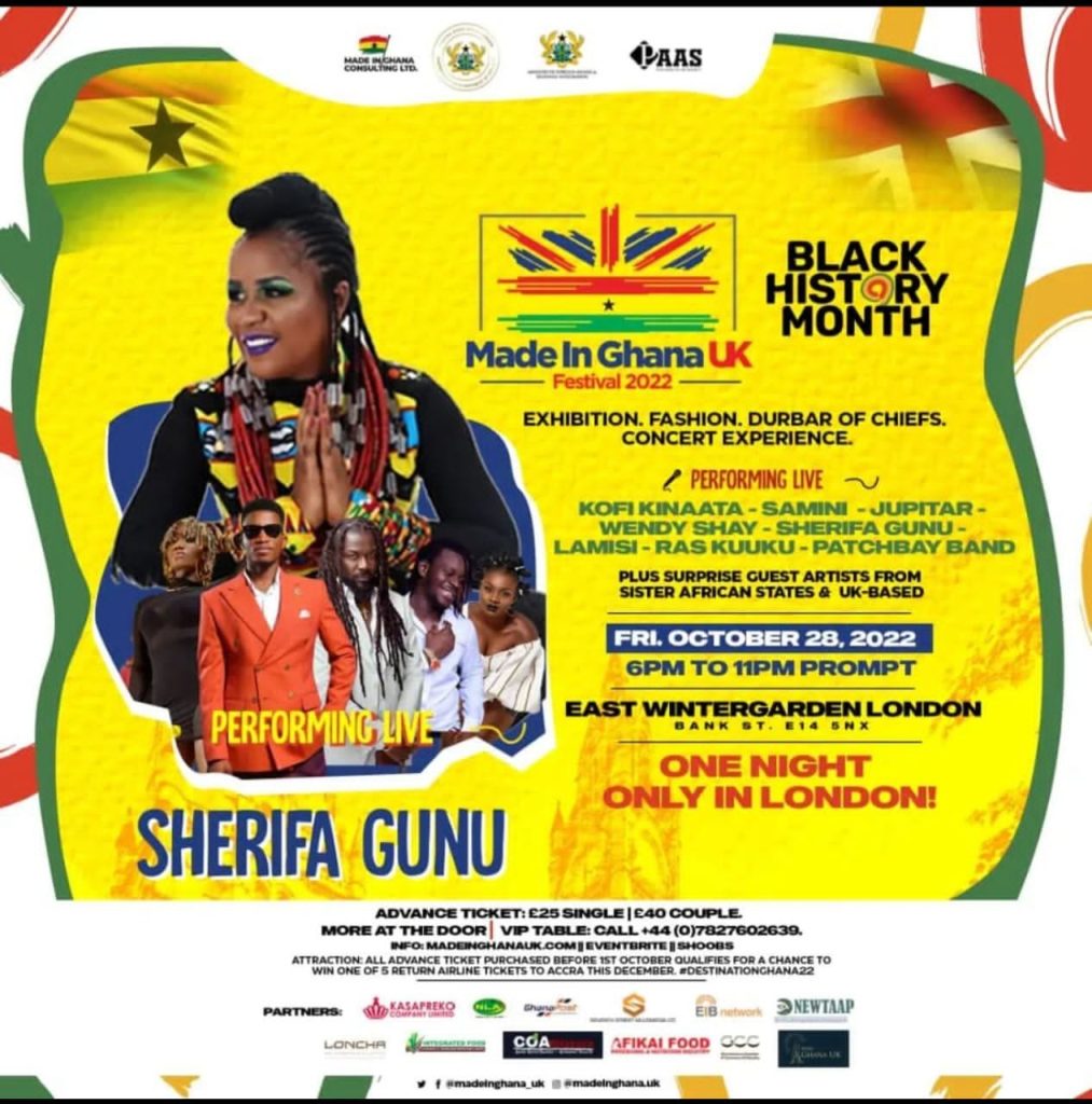 Sherifa Gunu headlines Made In Ghana UK Festival 2022, It is organized by Made In Ghana UK Ltd (London) and Made in Ghana Consulting Ltd (Accra).